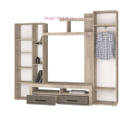 Недорогая стенка для гостиной Марсель со шкафом для одежды и выдвижными ящиками. Гостиная в современном стиле с фактурой натурального дерева, лаконичным дизайном и металлической фурнитурой цвета «Мокрый асфальт». Глубина платяного шкафа с выдвижной штангой для одежды 398 мм, глубина отсека с полками 334 мм.