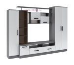 Стенка в гостиную Оскар-5 длиной 190 см представляет из себя вместительную систему хранения с платяным шкафом, витриной для посуды и тумбой для ТВ. Гостиная выпускается фабрикой в нескольких современных цветовых решениях, в том числе в сочетании темно-серого корпуса со светлыми фасадами в цвете серый камень.