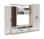 Стенка в гостиную Оскар-5 длиной 190 см представляет из себя вместительную систему хранения с платяным шкафом, витриной для посуды и тумбой для ТВ. Гостиная выпускается фабрикой в нескольких современных цветовых решениях, в том числе в сочетании корпуса под дерево дуб крафт серый с фасадами цемент.