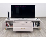 Тумба для телевизора шириной 180 см с высокими опорами. Тумба Парус-13 с двумя выдвижными ящиками и двумя закрытыми полками. Тумба ТВ светлого бежевого цвета кашемир и золотой фурнитурой. Ящики полного выдвижения и петли с доводчиками обеспечят долгий срок службы.