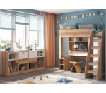 Кровать продается в комплекте с удобной лестницей, угловым шкафом и открытыми полками для хранения. Мебель для детской Киви с белыми матовыми фасадами подходит для мальчиков и девочек благодаря современному сочетанию цветов и рельефному рисунку в виде пазла на фасадах.