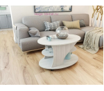 Недорогой овальный журнальный стол с колесной опорой имеет три уровня.