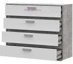 Современный недорогой комод шириной 1 метр с четырьмя выдвижными ящиками. Корпус комода серого цвета, под бетон, а фасады матовые белые. Выдвижные ящики с шариковыми направляющими обеспечивают комфортную и долговременную эксплуатацию. Комод входит в серию мебели Денвер и подходит для прихожей и спальни в том же цвете.