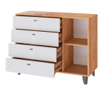 Комод 120 см с 4 выдвижными ящиками и дверцей подходит для спальни и гостиной. Комод с качественным фасадом из МДФ белого цвета и корпусом под дерево золотистого цвета отличается надежностью: ящики полного выдвижения, створка с доводчиками, высокие опоры черного цвета и оригинальные ручки. Комоды Катрин-13 длиной 120 см выпускаются в нескольких цветах и вписываются в любой интерьер.