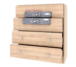Недорогой комод для Спальни Мадлен с 4 выдвижными ящиками. Комод в цвете дуб сонома шириной 82 см с оригинальными ручками и накладками из МДФ в цвете дуб серебро.