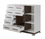 Вместительный комод шириной 120 см с 5 ящиками, дверцей и открытой полкой Модена. Комод в сочетании белого цвета и венге и подходит для гостиной Модена, спальни и прихожей. Пять ящиков комода полного выдвижения с шариковыми направляющими, отделение с полками шириной 37,7 см и открытая ниша 38х36 см помогут разместить всё в идеальном порядке.