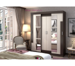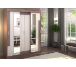 Недорогой шкаф купе с тремя отделениями: два отделения со штангами и центральное отделение с полками. Центральные дверцы распашные, боковые двери-купе (откатные). Изюминкой шкафа стало интересное решение зеркальных вставок на фасадах. Несмотря на невысокую стоимость, шкаф очень вместительный и имеет его общая длина 160 см, а высота 210 см.