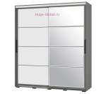 Современный вместительный шкаф купе шириной чуть меньше 2 метров. Шкаф в цвете графит серый с двумя дверями купе: зеркальной и дверью со стеклом белого цвета. Внутри шкафа два отделения: штанга для одежды 95 см и отсек с полками. Отделение с полками разделено на две части по 47 см: 5 полок для вещей и три полки с двумя выдвижными ящиками. Внутри шкафа-купе есть дополнительные полки наверху. Высота шкафа 2.15 метра подходит практически для любых квартир.