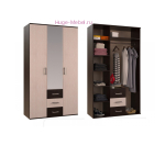 Узкий шкаф трехстворчатый для одежды с 3 ящиками и зеркальной дверью. Шкаф  оснащен металлической штангой  и полками для одежды. Недорогой шкаф для гостиной Белла сочетается с другой мебелью из этой же серии.