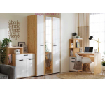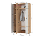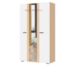 Трехстворчатый шкаф для одежды с зеркалом. Внутри шкафа два отделения: отсек с полками шириной 30 см и отсек со штангой для одежды на плечиках с двумя полками. Шкаф шириной 120 см с фасадами белого цвета и корпусом под дерево. Шкаф можно дополнить другой мебелью для спальни, гостиной и прихожей из серии Санса.