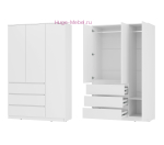Трехстворчатый шкаф белого цвета с тремя выдвижными ящиками. Шкаф для одежды шириной 120 см можно дополнить полками ПЛ-06 и ПЛ-07. Высота шкафа 190 см, при желании можно увеличить высоту шкафа на 49 см при помощи антресоли ТБ-18. Внутри шкафа две штанги для одежды. Шкафы Симпл выпускаются в сером и белом цвете.